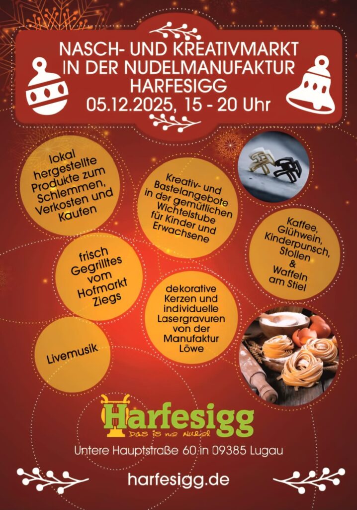 Am 05.12.25 sind wir von 15-20 Uhr in der gemütlichen „Wichtelwerkstatt“ auf dem Naschmarkt beim Harfesigg in Lugau vorzufinden. Hier können sich Kleine und Große zum Basteln niederlassen. Ein paar Produkte bringen wir natürlich auch mit.